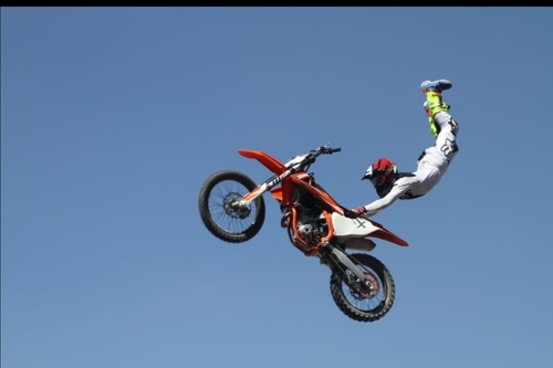 Motorbike stunt-show where the riders somersault in the air